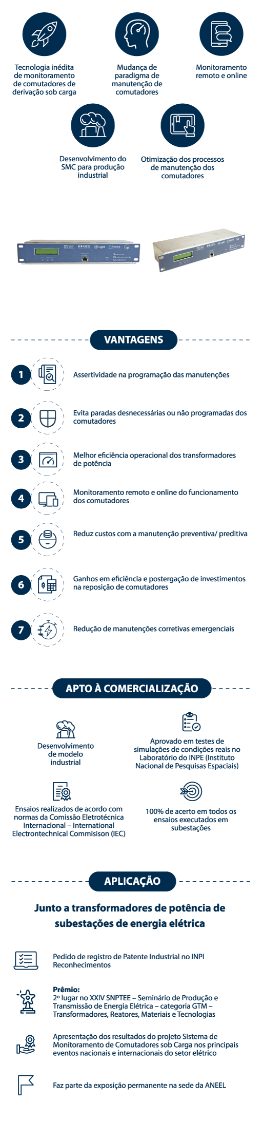 Inovação: Desenvolvimento de um hardware que monitora on-line as assinaturas elétricas das correntes de fases com algoritmos, que fornecem o diagnóstico dos componentes da comutação (desgastes dos contatos, defeitos internos e/ou no motor), determinando assim o ponto ótimo para a manutenção dos equipamentos.