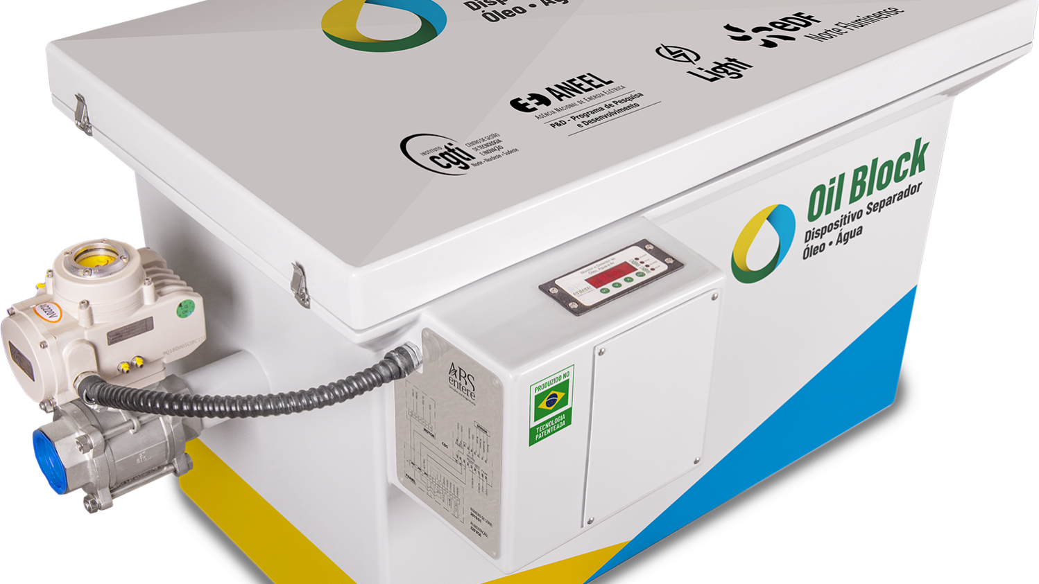 O dispositivo separador, é composto por uma caixa fabricada em fibra de vidro e resina especial para altas temperaturas, com mantas e válvula que permitem em caso de vazamentos de transformadores a separação da água e retenção do óleo; o monitoramento e a sinalização da ocorrência, impedindo a contaminação do solo e subsolo.